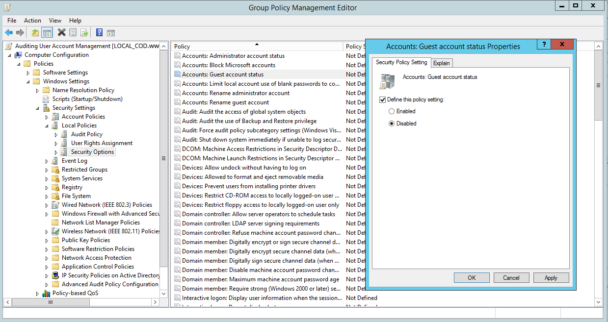 Por meio de uma conta de convidado, os usuários podem obter acesso a dados confidenciais. Essas contas concedem acesso a um computador Windows e não exigem senha. Para garantir que estas contas estejam desativadas crie a seguinte política de grupo: